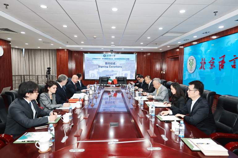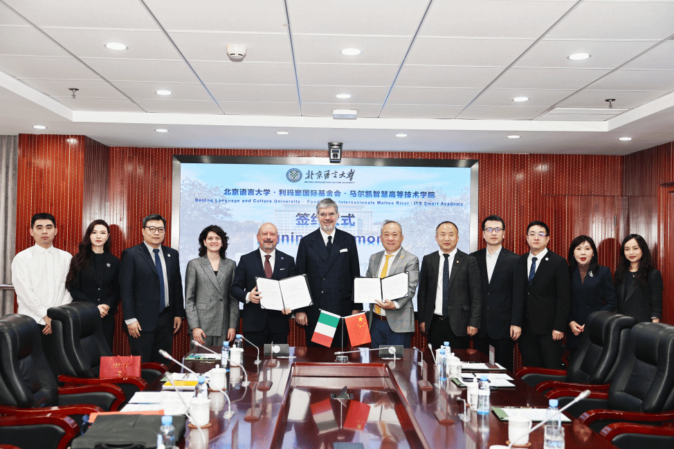 BEIJING, March 13, 2026 — Duan Peng, President of Beijing Language and Culture University (BLCU), met with Italian Ambassador to China H.E. Massimo Ambrosetti and Dario Grandoni, Chairman of the Fondazione Internazionale Matteo Ricci, along with their respective delegations at BLCU. The two sides held in-depth discussions on cooperation regarding the establishment of the BLCU Italian Campus and other initiatives, followed by a signing ceremony.